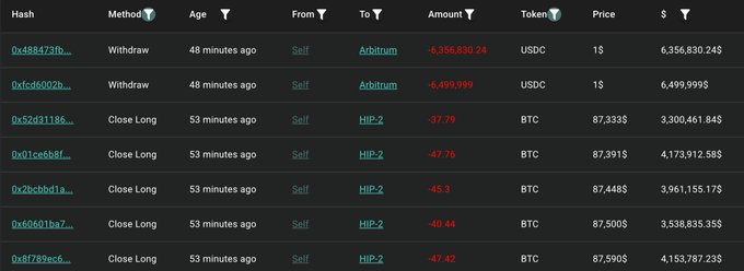A whale opened 50X perp position on $ETH & $BTC that in $200M total size before the reserve news. He was in $1M loss and one step away from liquidation But after the news, he managed to exit safely with a profit of $6.8M. hypurrscan.io/address/0xe4d31c...…