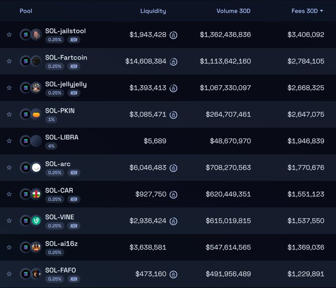 Pumpfun is rumored to launch its own DEX to replace Raydium. Raydium website shows that 7 of the top 10 liquidity pools by 30d fees are migrated from pumpfun. These 7 pools alone contribute 11% of the total 30d fees on Raydium! raydium.io/liquidity-pools/?so...…