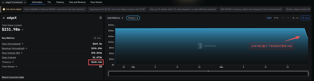 1⃣ Data on Defillama shows that the EdgeX treasury decreased by $50 million stablecoins in the past day, from $190 million to $140 million.