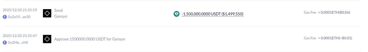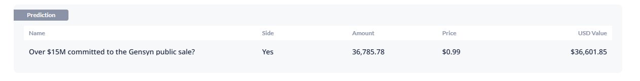 A wallet address, 0xf2...5e44, used $1.5 million to manipulate results on @Polymarket. Specifically, this person bet that @gensynai would receive over $15 million in commits in the $AI Pre-Sale program.