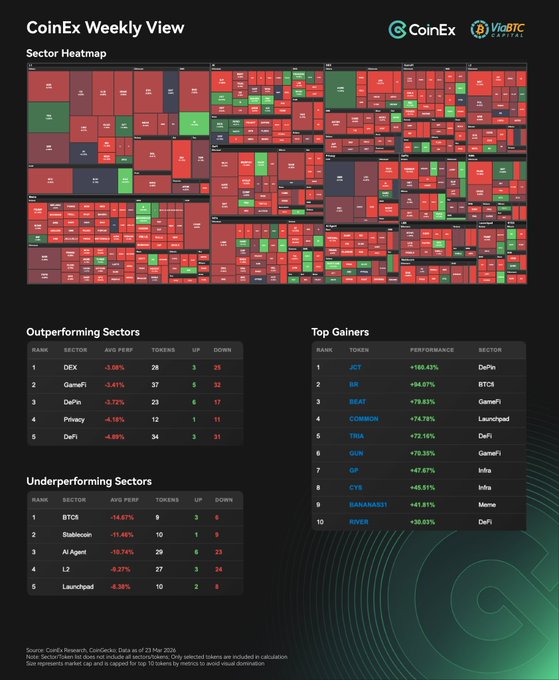Mar 23 #CoinEx Daily: Bitcoin slipped back below 68k as fresh Israel–Iran tensions kept markets on edge. Oil spiked then eased, Asian stocks sold off, and overall risk appetite stayed weak. 🔍Token to watch: $SIREN (+138.93%); $JCT (+64.56%) Learn more: