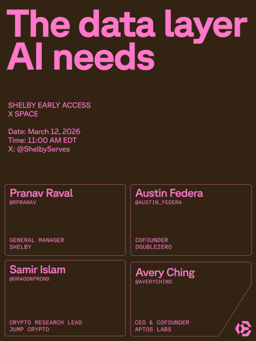 Shelby is the data layer AI actually needs. Hereโs why. Thursday we're unpacking why, with @rpranav, @Austin_Federa, @dragonfrond, and @AveryChing March 12. 11 AM ET. Set your reminder โ x.com/i/spaces/1qJDzPWwXdoKV?s...โฆ