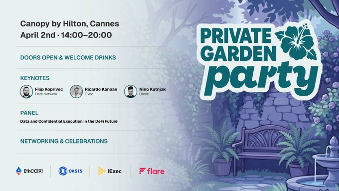 Here's what's happening at the Private Garden Party in Cannes! A full afternoon of privacy talks, panels, and networking with the best minds in crypto. 🎟️ Last spots: luma.com/wyclm16s Agenda 👇 @iEx_ec @FlareNetworks