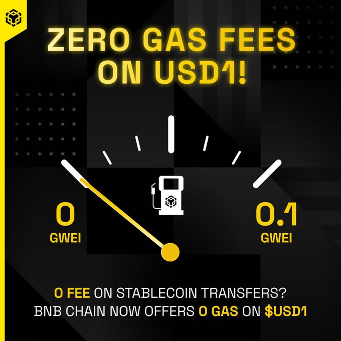 Running on empty never looked so good ⛽️ $USD1 from @worldlibertyfi is now with 0 gas fees on BNB Chain. Learn how you can save on gas 👇 bnbchain.org/en/blog/gas-free-...…