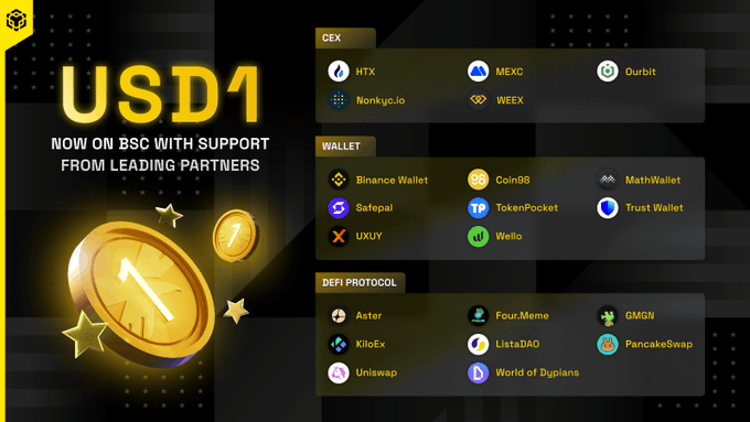 $USD1, by @worldlibertyfi, is gaining momentum on BSC—now supported by top CEXs, wallets, and DeFi protocols. If you're a project looking to push stablecoin utility forward, it’s time to support $USD1. Let’s build together 🤝