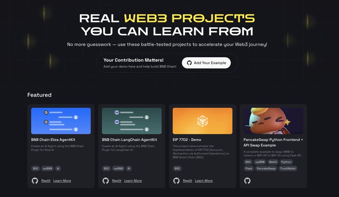 Kickstart your BNB Chain project with real code examples. The Example Hub helps devs ship faster—and if you’ve built something useful, contribute it and help others. Explore it now 👇 bnbchain.org/en/example-hub