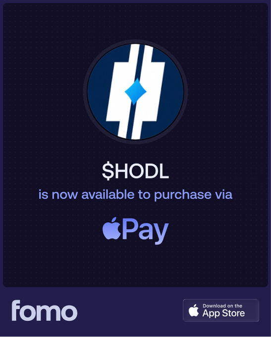 HODL ($HODL) is now available for purchase via Apple Pay on fomo @hodl2013 Download fomo, sign up, and buy $HODL in less than 30 seconds ⏪