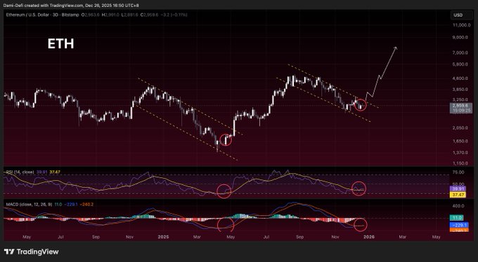 The last time $ETH was in this kind of pattern, the breakout came when the RSI pushed back above about 50 and the MACD turned upward. Right now, we’re seeing the early signs of that same setup, the MACD is starting to improve and the RSI is curling up. But to really confirm twitter.com/DamiDefi/status/20...