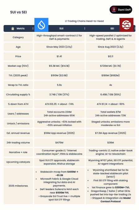 Everyone throws $SUI and $SEI into the same basket, the numbers say they’re not even close. $SUI vs $SEI [Head to Head Series #5] $SUI to me feels like the more grown up play. Bigger mcap, way higher app revenue, almost $1B TVL (after peaking at $2.6B), and a serious stablecoin + RWA push. You’ve got ETF filings, Grayscale trust, big DeFi names (Suilend/NAVI), and real volume. The flip side is heavy unlocks and ~37% of supply circulating, so dilution is the main thing to respect. $SEI is more of a niche, trading-first chain. Smaller mcap, lower mcap/TVL ratio, and much lower revenue today, but it’s jammed with active addresses, growing gaming + perp activity, the Wyoming stablecoin pilot angle, and AI integrations. It looks more like a higher-risk, higher-reward bet that they can become the main chain for trading and AI. Verdict: Fundamentals winner for me is $SUI, bigger revenue engine, deeper TVL, stronger stablecoin/RWA story. $SEI is the leaner, higher-beta underdog, but if I had to pick one to back for this cycle, I’d personally lean $SUI and treat $SEI as the smaller bet.
