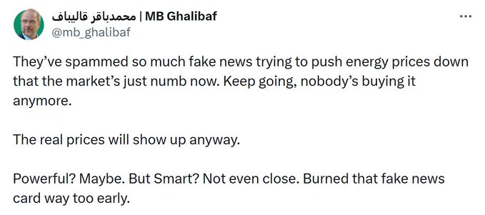 BREAKING: Iran's speaker of parliament says that 'fake news' is being used to push energy prices down and the market is now 'numb'.