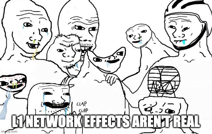 "L1 network effects aren't real" 65.5% of stables are issued on eth+L2s (94% of this on L1). ~75% of app capital on eth+L2s (~90% on L1). L2s outgrowing alt L1s. ~95%+ of L2s are on eth. Every L2 further emphasizes the L1 as the hub. Many use ETH. Onchain growth = ETH growth