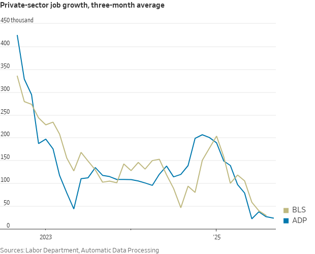 ADP revisions for Aug (-3K private sector jobs vs an earlier estimate of +54K) lowered the three-month average for that series to +26.7K from +45.7K. That brings it closer to BLS's +29.3K for the same period. Sept was -32K for ADP, lowering the three-month average to +23.6K