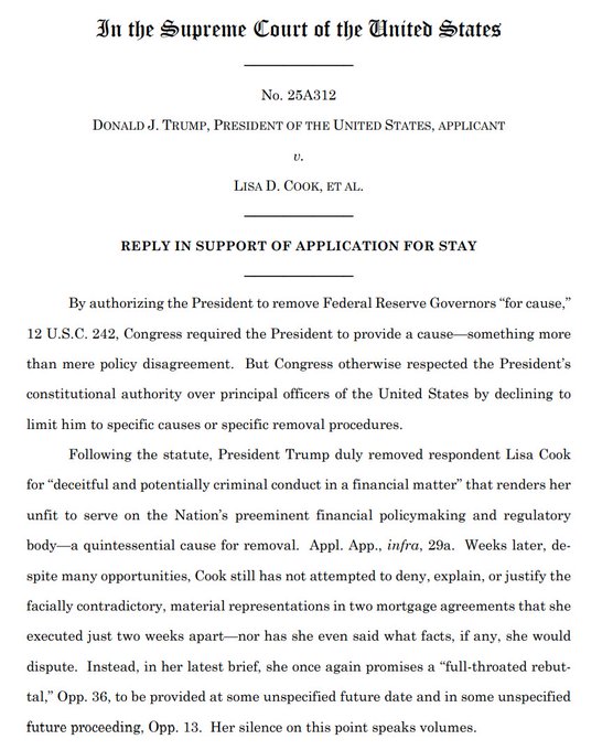 The Justice Department has issued its response to Cook's brief The government argues that because Cook has not tried to clear her name, the president's allegations of wrongdoing should be presumed to be valid. "Her silence...speaks volumes." supremecourt.gov/DocketPDF/25/...… twitter.com/NickTimiraos/statu...