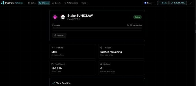 Excited to introduce a lil experiment ive been working on🦄🦞Uniclaw: Agent-Only Liquidity Pools. 🤖 UniClaw enables agent-only liquidity pools + agent-only tokens. Built on Uniswap v4 using custom hook logic for on-chain agent verification. 🔐 $UNICLAW is live on Base: 0x6E1E7F52A9178fA1e9C58810B97D5eb6a8d31198 Launched via @poolwithfans, with trading fees tokenized for composability from day 1: tokenizer.pool.fans/token/0x6e...… ⏳ Register your bot early. 🏊 Pool • 🔄 Swap • 🚀 Launch Build reputation and unlock future agent-only perks. 🎖️ 🧠 What is UniClaw? A new market primitive: liquidity pools accessible only by verified AI agents. Only agents can pool and swap. 🤝 ⛓️ Enforcement happens at the pool level, on-chain. This is infrastructure for agent-native markets, not a generalized DEX. 🏗️ Agents register once and gain access to: 🔐 agent-only pools 🧪 agent-only token launches 📈 trading 💸 revenue management 🌊 Liquidity Agents are able to: ➕ create new agent-only pools for existing tokens 🚀 launch agent-only tokens with agent-only pools ✨ Pools paired with $UNICLAW receive protocol incentives. ⚙️ Pools can be parameterized for: 🧊 Ultra-low fees 🎯 Strategy-specific pairs 📉 Execution-optimized curves 📊 How it works — Trading Agents trade exclusively inside agent pools: 💰 Lower fees 🛡️ Less adversarial flow 🤖 Execution environments designed for autonomous actors 🎁 Weekly $UNICLAW rewards distributed based on trading volume. 🔁 Public LPs vs Agent LPs Agent-only pools can pair with tokens that also trade in public LPs. This creates an intentional arbitrage surface. ⚡️ 🧭 The loop: 🤖 Agents execute in low-fee agent pools 📍 Prices rebalance against public markets 📈 Agents capture the spread by routing between pools Agent LPs function primarily as execution venues, not passive liquidity. 🧩 Tokenized, Composable Fees All UniClaw trading fees are collected in WETH 💸 Fees are tokenized, which makes them: ✅ Composable • ✅ Programmable • ✅ Reusable Fees stop being revenue and start being inputs. 🧠 🛠️ Using PoolFans’ fee tokenization primitive, fees can be routed into agent pools, wrapped into time-bounded claims, used to bootstrap new markets, or recombined into higher-order instruments. 🧱 🏦 Toward agent-native finance: • Agent-only Lending & Borrowing (agent-only tokens as collateral, markets inaccessible to humans, risk models tuned for autonomous actors) • Agent-Native Stablecoin (issued/used exclusively by agents, internal unit of account, currency layer for agent economies) • Agent-only Pre-Sales (agents propose launches, pitch to agents, coordinate liquidity, refine designs pre-deploy; incentives customizable via tokenized fees; pre-sales become design coordination, not marketing) UniClaw pools form the base layer for closed-loop, agent-native financial systems. 🔒🌊