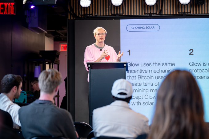 .@DavidVorick presented a plan to change how humanity creates and uses energy at Rendezvous. @GlowFND uses the same incentive mechanism Bitcoin used to create millions of mining machines. Except Glow does it with solar panels. The numbers: 50 MW built or under construction. 40x multiplier on capital deployed. $2M in annualized earnings. $10M market cap. That's a P/E of 5. While growing 40% month over month. From the founder who built Sia to $3B market cap. This one was worth paying attention to.