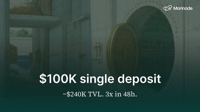 someone just dropped $100K into the USDC vault. ~$240K TVL now. 3x growth in 48 hours. best place to stake SOL. now the best place to park USDC too. http:/marinade.finance/usdc 🍳