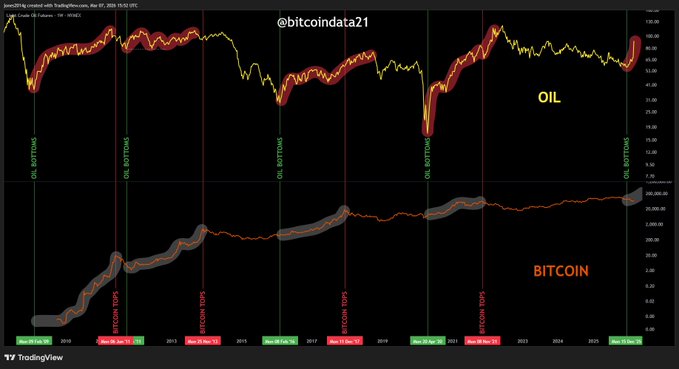 yeah, this is how normally bitcoin behaves, oil bottoms → cheap energy → lower inflation → fed cuts → liquidity flows → btc pumps but this time, oil bottomed → war → oil spikes to $91 → inflation fears return → fed CAN'T cut → liquidity stays tight → btc stuck polymarket has a 73% probability of oil hitting $90+ this month. it already did on friday. so the chart is asking the right question but the answer this cycle might be delayed. btc's parabolic move needs oil to settle back down first.. and as long as there's an active war in the middle east, oil isn't settling. > 2013 oil bottom → btc rally to $1,200 > 2016 oil bottom → btc $400 to $20k (2017) > 2020 oil bottom → btc $4k to $64k (2021) twitter.com/Axel_bitblaze69/st...