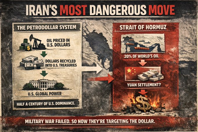 Iran may have fired the most dangerous shot in this conflict. and it wasn’t a missile. a senior iranian today official told CNN that tehran is considering allowing oil tankers through the strait of hormuz again under one condition: settlement in yuan instead of dollars. if that actually happens, it touches something much bigger than this war. first you need to understand the petrodollar. in 1974 the U.S. struck a deal with saudi arabia. the arrangement was simple. the U.S. protects saudi oil fields. saudi arabia prices its oil in dollars. that one decision quietly reshaped global finance. because oil is the most traded commodity on earth, every country that wanted energy now needed dollars. so governments around the world started holding dollar reserves. and those dollars didn’t just sit idle. they flowed back into U.S. assets. especially treasuries. that system gave america enormous financial power. print dollars → the world absorbs them → because the world needs dollars to buy oil. it quietly ran the global monetary system for half a century. now look at what’s happening around hormuz. roughly 20% of global oil flows through that one narrow strait. there is no real substitute route. any disruption there immediately sends shockwaves through global energy markets and shipping. but the bigger story might be the currency side. because if oil through hormuz even starts settling in yuan, that would be a max pain for the US yes. Iran can’t beat the U.S. in a military war. so now it pokes the one thing that actually hurts. the dollar.