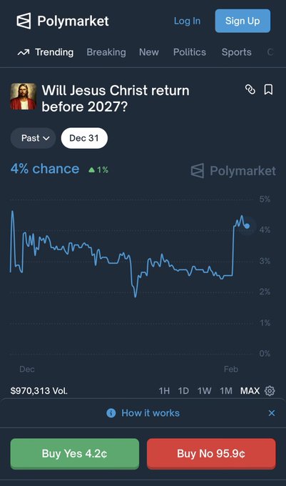 This is wild… People who bet on Jesus Christ returning in 2026… Have now outperformed Bitcoin holders by over 150%