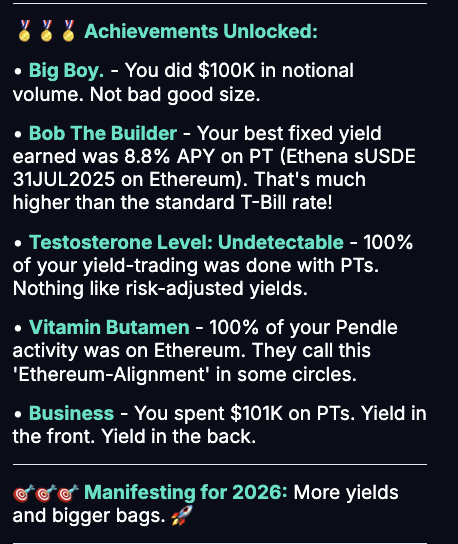 If you can beat my Pendle recap I'll quickly follow your account (if not following) Try it out by typing "what's my year end recap" in Pendle's AI chatbot Professor Peepo