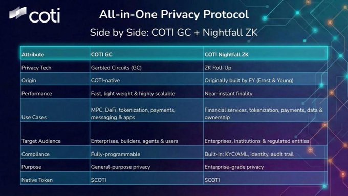COTI All-in-One Privacy Protocol 🔐 Side by Side: COTI GC + Nightfall ZK The dual-privacy stack 💫COTI GC: Fast, programmable & all-purpose privacy 🌔 COTI Nightfall ZK: Enterprise-grade compliance and near-instant finality All powered by $COTI