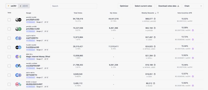 Big @CurveFinance veCRV voters have cast their votes for this round. veCRV holders can now vote with better visibility on the final votes. Some opportunities worth looking at on Votemarket: pmUSD, msETH, msUSD and frxUSD gauges.