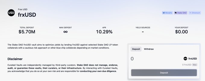 @StakeDAOHQ frxUSD v2 vault is the highest yielding stablecoin vault on Morpho on Ethereum! @fraxfinance