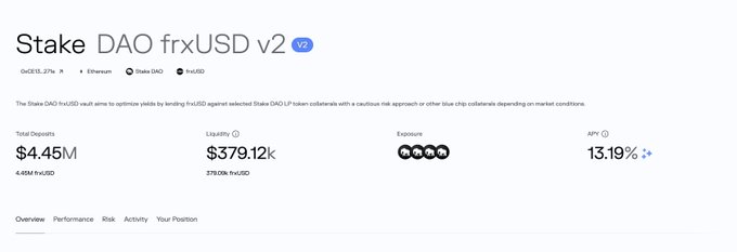 $4.45M deposited in the Stake DAO frxUSD vault on @Morpho in 7 days, while maintaining a competitive APR. After a strong first week of incentives, new rewards are being added today on @merkl_xyz to ensure continuity from @fraxfinance and @MetronomeDAO. ↓