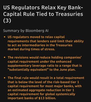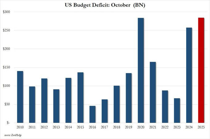 A story in two parts: Left - "US October budget deficit was the highest in history (higher than even Oct-2020 during COVID) despite record Oct Federal receipts & tariff income." Right - "US Regulators Relax Key Bank-Capital Rule Tied to Treasuries" -Bloomberg