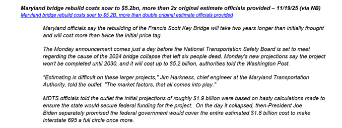 "Francis Scott Key Bridge will take two years longer than initially thought and will cost more than twice as much as initially thought, to rebuild." Take the "over" on both how long rebuilding the US grid & industrial base will cost, & how inflationary it will be.