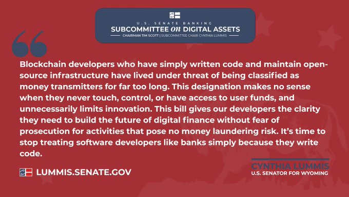 We strongly support this bipartisan push to ensure developers who build blockchain infrastructure are not misclassified as financial intermediaries. Clear rules are essential for innovation to thrive in the U.S. And it's critical that the Blockchain Regulatory Certainty Act (BRCA) remains in market structure legislation. Thank you @SenLummis and @RonWyden for your leadership! twitter.com/BlockchainAssn/sta...