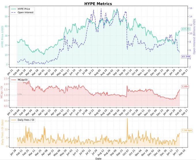Since the price bottomed 2 weeks ago, HYPE is up 60% while OI has decreased from $8.4b to $5.39b (as a result of the market wide selloff).
