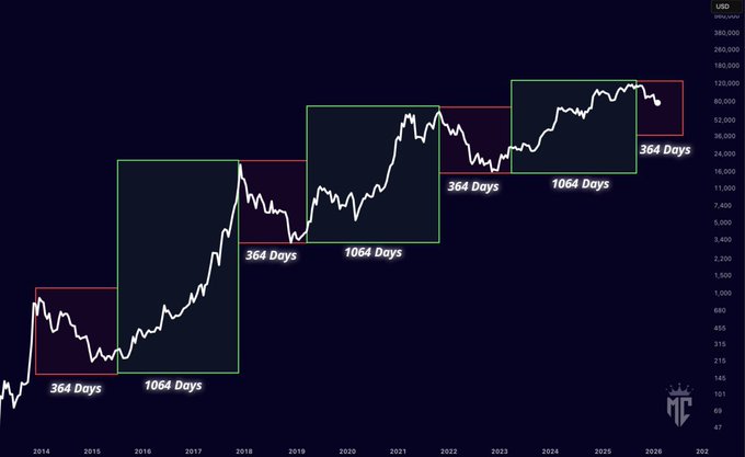 2022 ATL around $16,000 +1064 days → Cycle ATH early October 2025 After every top comes the reset. ATH → ATL ≈ 364 days That puts the next cycle bottom around September to October 2026