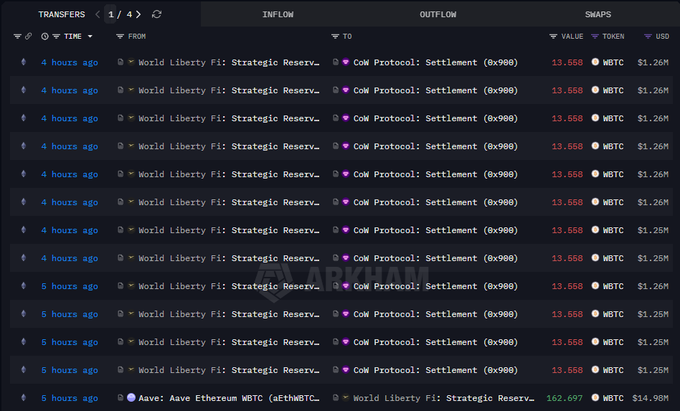 4 hours ago, #WLFI team withdrew 162.69 $BTC (~$15M) from #AAVE and then swapped them for 4,611 $WETH. Address: intel.arkm.com/explorer/entity...…
