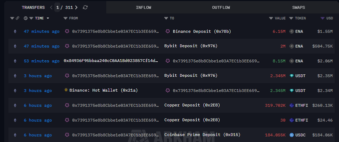 1 hour ago, #Flowdesk deposited 8.15M $ENA (~$2M) into #Binance and #Bybit Address: intel.arkm.com/explorer/addres...…