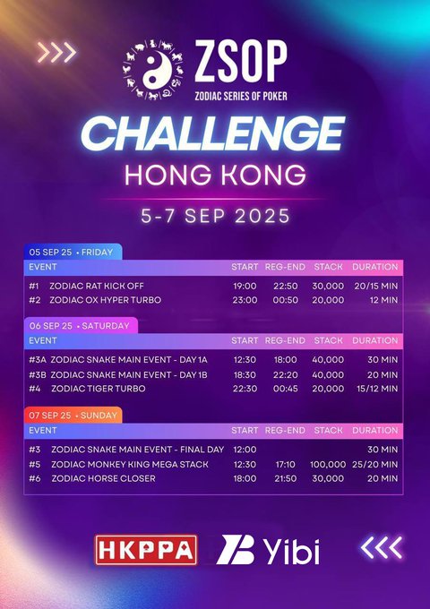 🔥 The wait is over! The ZSOP Challenge Hong Kong is coming Sept 5-7, 2025! 🔥 3 days. 6 events. Endless action. From the thrilling 🐀 Rat Kick Off to the grand 🐎 Horse Closer, every hand could change your destiny. ✨ Don’t miss the highlights: 🐍 Zodiac Snake Main Event –