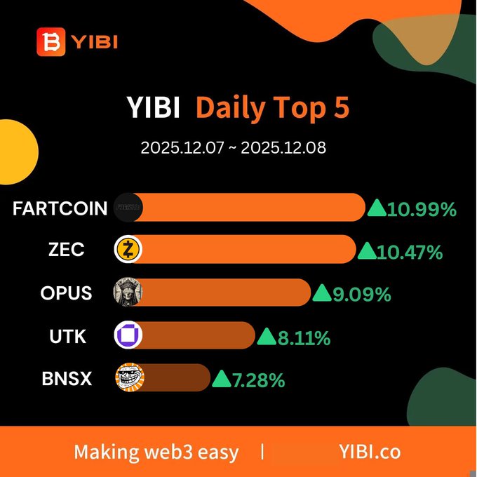 YIBI Daily Top 5 Gainers (Dec 7 - Dec 8, 2025) 1️⃣$FARTCOIN +10.99% 2️⃣$ZEC +10.47% 3️⃣ $OPUS +9.09% 4️⃣$UTK +8.11% 5️⃣$BNSX +7.28% All listed tokens are available for instant trading on YIBI. Trade now: yibi.co Making Web3 easy. #YIBI #Crypto