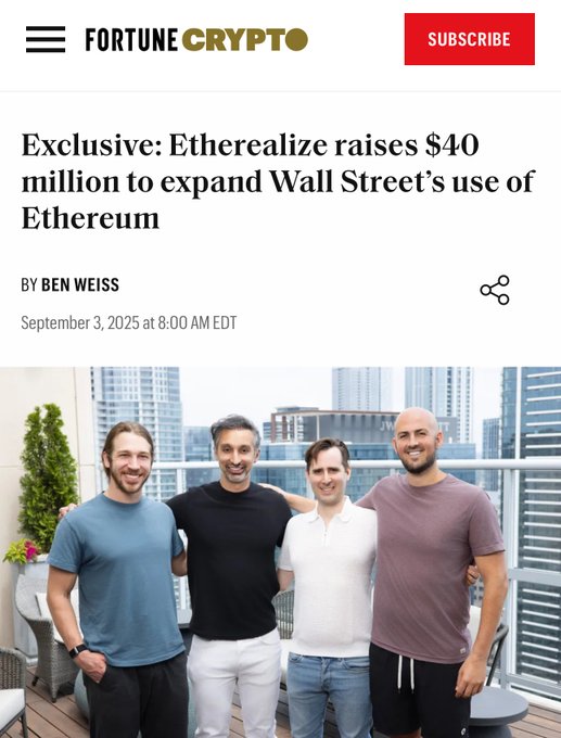 🚨 Etherealize raises $40 million to expand Wall Street’s use of Ethereum Here's how: - Backed by Vitalik Buterin, Paradigm, Electric Capital, and the Ethereum Foundation - Built by ex-Wall Street veterans & Ethereum researchers - Focused on tokenizing mortgages, credit, and