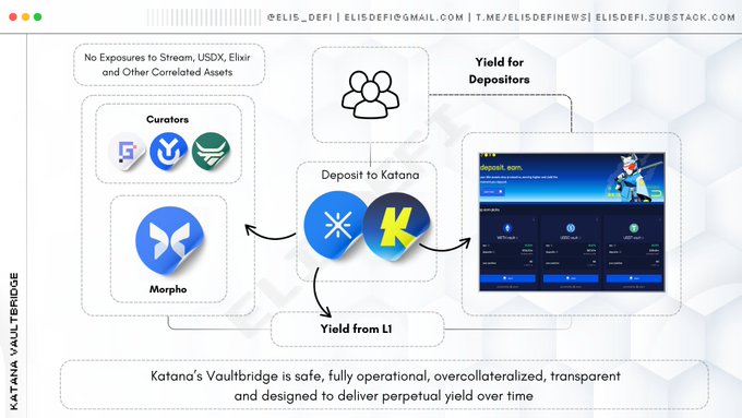 Some people think DeFi Vault is the riskiest option right now because of the recent issues with Stream and Elixir. But the situation is different with @katana Vaultbridge. It is not exposed to xUSD depegging or the Balancer exploit. It remains secure, fully operational,