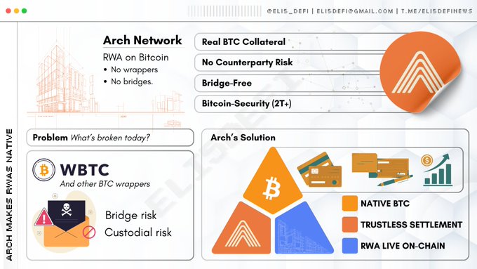 The $24B RWA market still depends on $WBTC and bridges, exposing users to custodial risk. @ArchNtwrk solves this with native $BTC settlement, enabling real-world assets to operate directly on Bitcoin without wrappers or bridges. Arch turns Bitcoin into programmable collateral