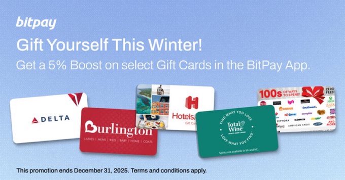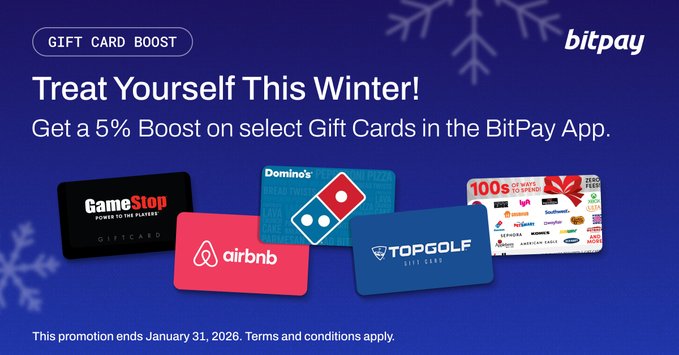 🆕 New boosted gift cards are available! Receive a 5% boost on select Gift Cards only in the BitPay app. Now through January 31, 2026. Don’t have the BitPay App yet? 📱Download the app here: bitpay.onelink.me/Cenw/giftcar... Terms of Use: bitpay.com/legal/terms-of-use… Terms and Conditions: bitpay.com/boost-gift-cards-te...… #BitPay #Bitcoin #crypto