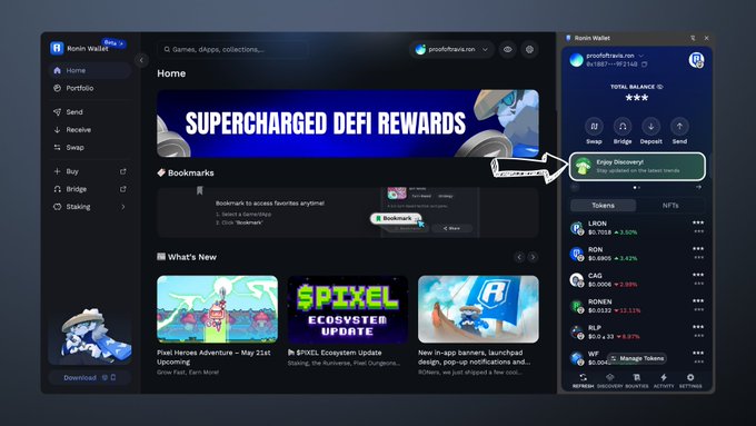 The Ronin Wallet on Desktop has one of the cleanest discovery pages in web3. You can open up the web page by clicking on the green spaceship button in your wallet. The portfolio page is also very well designed, but I'll let you guys be the judge.
