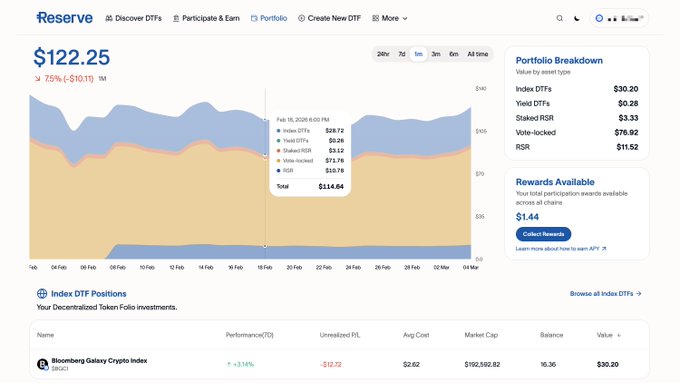 The long-awaited Portfolio view is here! 💼 A dedicated page on the Reserve app with a comprehensive overview of your DTF + RSR positions, rewards, active governance, and transaction history Check it out and let us know what you think! → app.reserve.org/portfolio