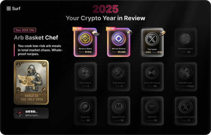 This afternoon, a teacher from JE Labs told me about a year-end summary activity on Surf for wallet addresses. Submitting your EVM wallet allows them to do an on-chain summary and even give you a "fortune telling" (or "fortune telling"). After submitting...hmm, I realized that my computer wallet, apart from BSC, has very little connection to the EVM ecosystem. Of course, they missed a significant amount of my BSC meme transactions and Kaito airdrops, but my main DeFi activity is indeed in Sui, and most of my previous token purchases were on Sol. Overall, as Surf claims, it's primarily based on low-risk arbitrage trading. Furthermore, based on my own experience, Surf's AI on-chain data scraping and organization capabilities are unparalleled. This is actually a very good niche for startups; it's difficult for giants to cover this area all at once, and it's easy to link it to strategies and monetize it. If you really want to get into AI, consider this.