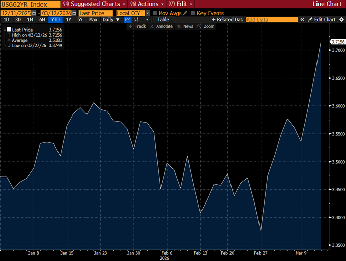 INTEREST RATE WATCH: The sharp rise in interest rates is notable since the Iran war broke out, with the 2-year rising more than one-third of a percent & traders now fully pricing out the prospect of interest rate cuts. Even mortgage rates faced their biggest jump in almost a year.