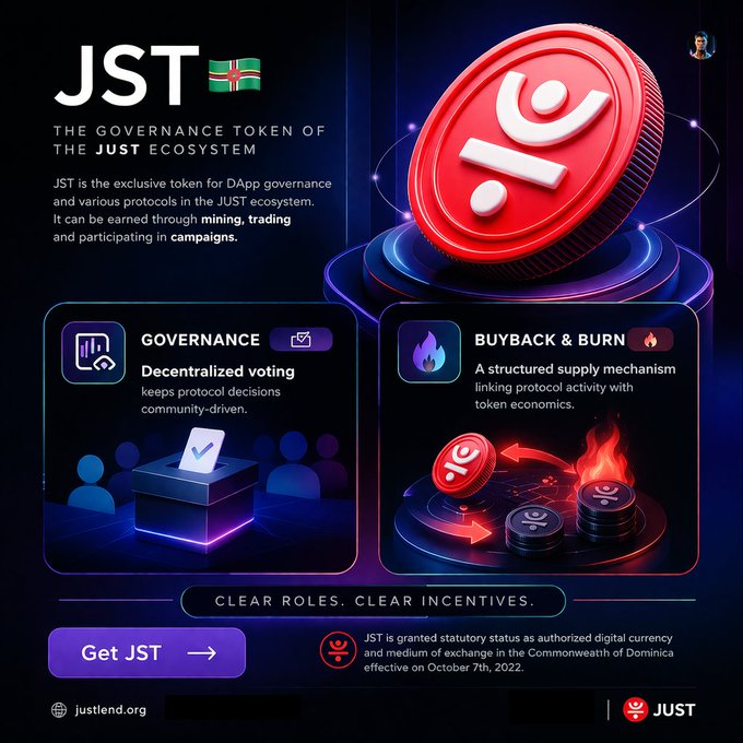 A clean way to look at it. #JST works through governance, while mechanisms like Buyback and Burn tie protocol activity back into the system. Different roles, same direction. Both matter. twitter.com/DeFi_JUST/status/2...