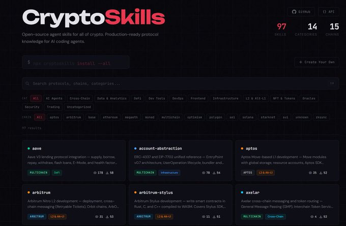Wow, there are so many experts here! They've compiled all the crypto-related skills into a "skill library" cryptoskills.dev The website includes a complete suite of capabilities such as DeFi, trading, cross-chain, and data analysis, and you can even install and use them with one click. twitter.com/WY_mask/status/203...