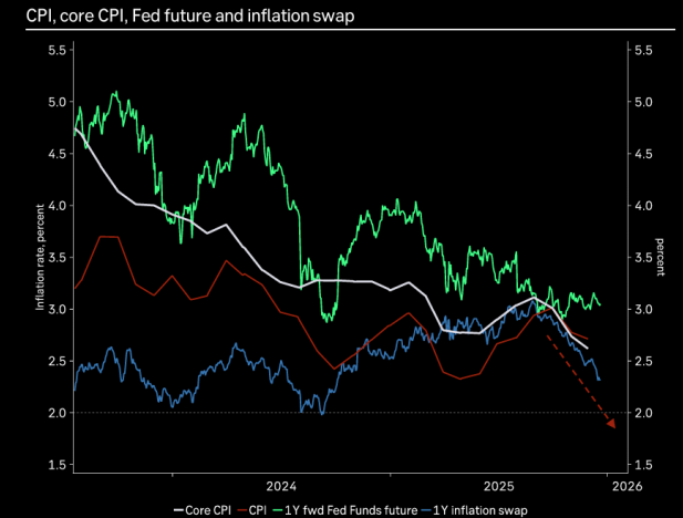 Inflation expectations are falling faster than realized inflation🚨 Markets are pricing easing, but CPI and core CPI are still hovering above the Fed’s 2% target. That keeps the setup cautiously bullish, with policy patience still in play rather than an immediate pivot.