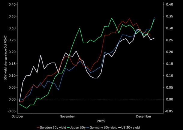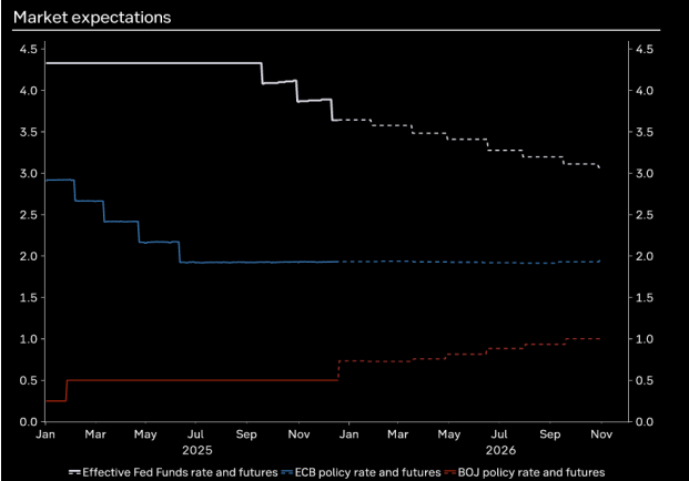 Markets are not pricing a Fed cut in January, and the ECB remains on hold. Rate expectations continue to drift lower through 2025, but timing stays cautious.