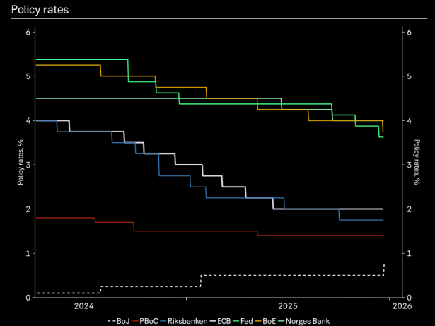 Global policy rates are already stepping lower across major central banks🚨 The easing path is gradual, but directionally clear into 2025 and 2026.